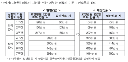 전체 가입자에 대한 120일 이상 요양병원 입원 시 별도 상한액 적용 관련해서는 기존 규정은 사회적 입원을 최소화하기 위하여 120일 이상 요양병원 장기 입원 시에는 다른 진료 시보다 높은 상한액 기준을 마련하고 있으나, 이를 소득 하위 50% 이하(1~3구간) 가입자에게만 적용해 왔다. 개정 시행령은 120일 이상 요양병원 장기 입원 시 별도 상한액 기준을 전체 가입자(소득 상위 50%, 4~7구간 포함)에게 확대하여 적용하도록 하고, 연평균 소득의 10% 수준으로 소득 상위 30%(5~7구간) 가입자의 본인부담상한액을 인상했다.