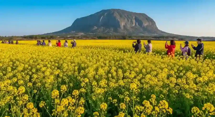 대한민국에서 가장 먼저 봄을 알리는 곳은 단연 제주도다. 제주의 유채꽃은 이미 2월 중순부터 꽃망울을 터뜨리기 시작해 3월이면 온 섬을 노랗게 물들인다. 특히 서귀포시 안덕면에 위치한 산방산 인근 유채꽃밭은 거대한 화산 암벽과 노란 꽃밭이 대비를 이루며 제주만의 독특한 풍경을 자아낸다. 검은 현무암 돌담 사이로 고개를 내민 노란 유채꽃은 찍는 곳마다 인생샷을 만들어주는 마법 같은 배경이 된다.